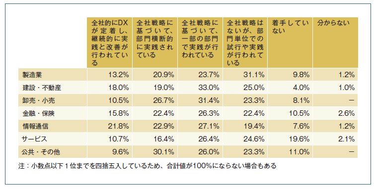 まず、①に関連して全社的なDX戦略自体の必要性は業種等によって異なる可能性があるため、業種別のDX実践状況を確認したものが、図1になります。