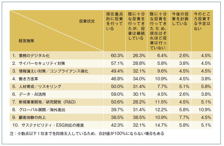 一方で、「全社戦略に基づいて、部門横断的に実践されている」「全社戦略に基づいて、一部の部門で実践が行われている」「全社戦略はないが、部門単位での試行や実践が行われている」のいずれかを選択した企業の経営施策に対する投資状況は、「既に十分な投資を行ってきたが、投資は継続している」の回答率が高くなっています。なお、DXに「着手していない」と回答した企業は、全ての経営施策に対し「今のところ投資する予定はない」という回答が最多でした。