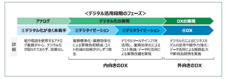 また、DXはデジタル技術やツールを導入すること自体ではなく、デジタルを活用して企業や組織の変革を通じた成長を目指すものであることは前述の定義のとおりですが、その前段階としてデジタイゼーションやデジタライゼーションと呼ばれるデジタル活用段階のフェーズがあるとされています。図3のように整理し、ここでは図の②デジタイゼーションおよび③デジタライゼーションを“内向きのDX”、④DXを“外向きのDX”と置いた上で、具体的なDX実践内容を見てみます。