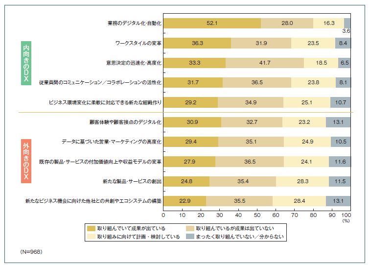 このように整理すると、全ての項目において半数以上の企業が取り組みを進めていますが、外向きのDXよりも内向きのDXの方が成果を上げていることが分かります。前年調査と比較すると、成果が出ているとの回答が増えている項目は「業務のデジタル化・自動化」(50.8%⇒52.1%)、「意思決定の迅速化・高度化」(32.9%⇒33.3%)、「ビジネス環境変化に柔軟に対応できる新たな組織づくり」(26.6%⇒29.2%)、「顧客体験や顧客接点のデジタル化」(28.5%⇒30.9%)、「データに基づいた営業・マーケティングの高度化」(28.9%⇒29.4%)、「既存の製品・サービスの付加価値向上や収益モデルの変革」(26.0%⇒27.9%)となり、内向きのDX・外向きのDXともに3項目に対する回答が増加しています。DXの定義に従うのであれば、外向きのDXにあるような項目に対する回答が増加していくかどうかが今後重要になっていくのではないかと思われます。