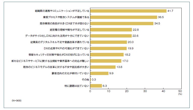 最後に、企業がDXを実践していく上で感じている問題としては、連携・コミュニケーション不足、業務プロセス・システムの複雑さ、DXに手が回らないというところに問題を感じている企業が多くなっています。一般的な企業では業務プロセスやシステムが複数の部署をまたぐことは珍しくなく、連携・コミュニケーションと業務プロセス・システムの複雑さが問題として挙げられることは容易に想像できます。また、手が回らない原因としては人材不足・人手不足が考えられます。