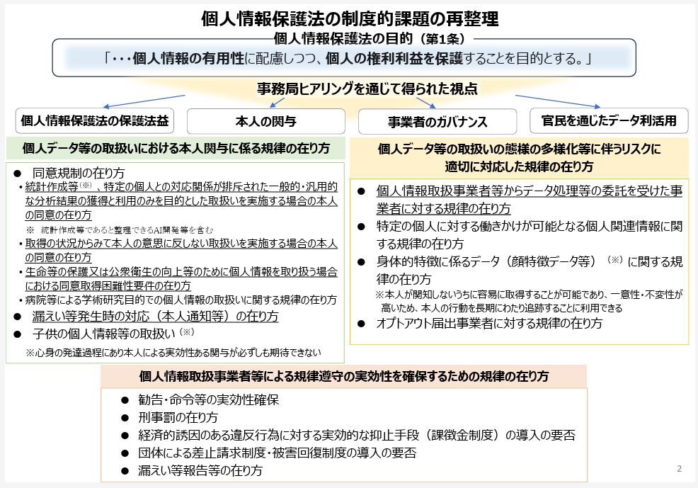 2025年1月22日には、2024年11月~12月にかけて個人情報保護委員会(以下、PPC)事務局が実施したヒアリング(以下、「事務局ヒアリング」)5を通じて得られた四つの視点(1.個人情報保護法の保護法益、2.本人の関与、3.事業者のガバナンス、4.官民を通じたデータ利活用)等を踏まえて、制度的な論点全体(2024年6月の中間整理で提示されていた個別検討事項に、「事務局ヒアリング」で明らかになった短期的に検討すべき論点を追加したもの)を、図1のとおり再整理したことが示されました6。図中下線が引かれている内容が2024年11月からの「事務局ヒアリング」を受けて追加された論点です。