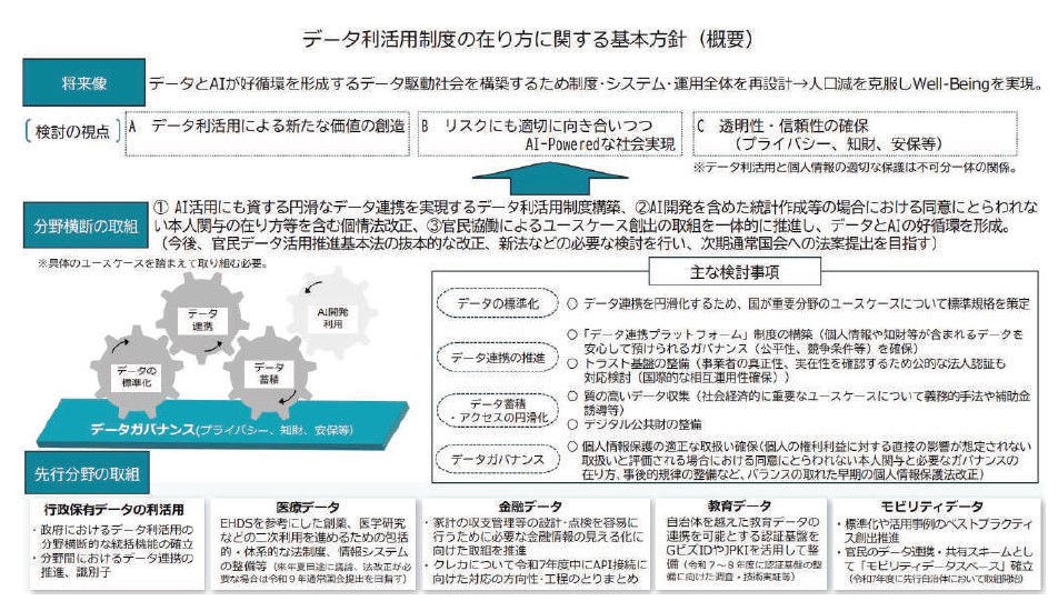 基本方針の取り組みを具体化するために、官民データ活用推進基本法の抜本的な改正、新法などに向けた必要な検討を行い、進めるとされています。また、個人情報保護法についても、データ利活用推進を下支えする礎となる法律として位置づけ、データ利活用全体や個別分野における制度整備と同時並行でアップデートを行う必要があることに留意するとされています。今後、データの利活用とガバナンスについて、一体的な検討が進められていくことと考えられます。
