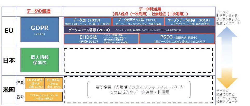- 5 諸外国の取り組みの例として、欧州連合(EU)、英国、米国の例が参考情報として記載されています。EUについては、個人情報保護を目的とした一般データ保護規則(GDPR)を基盤としつつ、公共部門におけるデータの二次利用や、民間企業のデータ共有を可能にする法制度の構築が進められているとされています。具体的には、データガバナンス法(2022年施行)や、データ法(2025年9月施行)により、信頼性のあるデータ仲介や分野横断的なデータアクセスの仕組みが制度化されつつあるとされています。また、欧州データ戦略(2021年策定)に基づいて、産業、ヘルスケア、モビリティ、金融などの重要分野ごとに、複数主体が分散的にデータを共有・連携できる「共通欧州データスペース」の整備が進められているとされています。