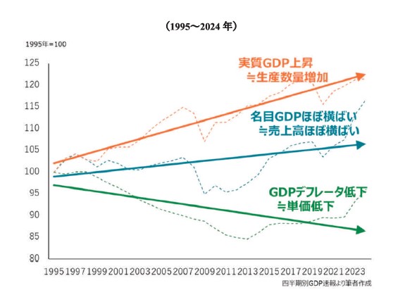 図1は、1995年の名目GDP・実質GDP・GDPデフレータを100として指数化したものである。この数字が示すのは、日本経済が量的拡大による成長を追求する一方で、付加価値(単価)の向上に失敗し続けているという深刻な事実である。つまり、「薄利多売」の構造が約30年間にわたって継続・深刻化している状況にある。
