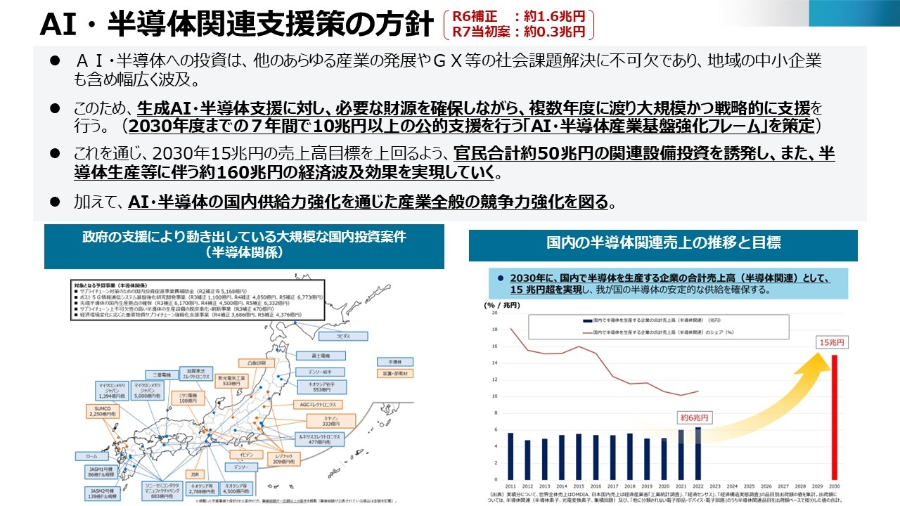 直近では、AI・半導体関連支援策に基づき、AI半導体産業基盤強化フレームを国として構築し、法案通過に向けた準備を進めているところです。