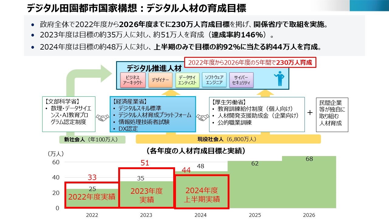 政府全体で2022年度から2026年度までの5年間で230万人のデジタル人材を育成するための取り組みを進めています(図5)。すでに2022年度には、33万人の育成に成功、2023年度も目標を超え51万人の育成を達成し、順調に進展しています。