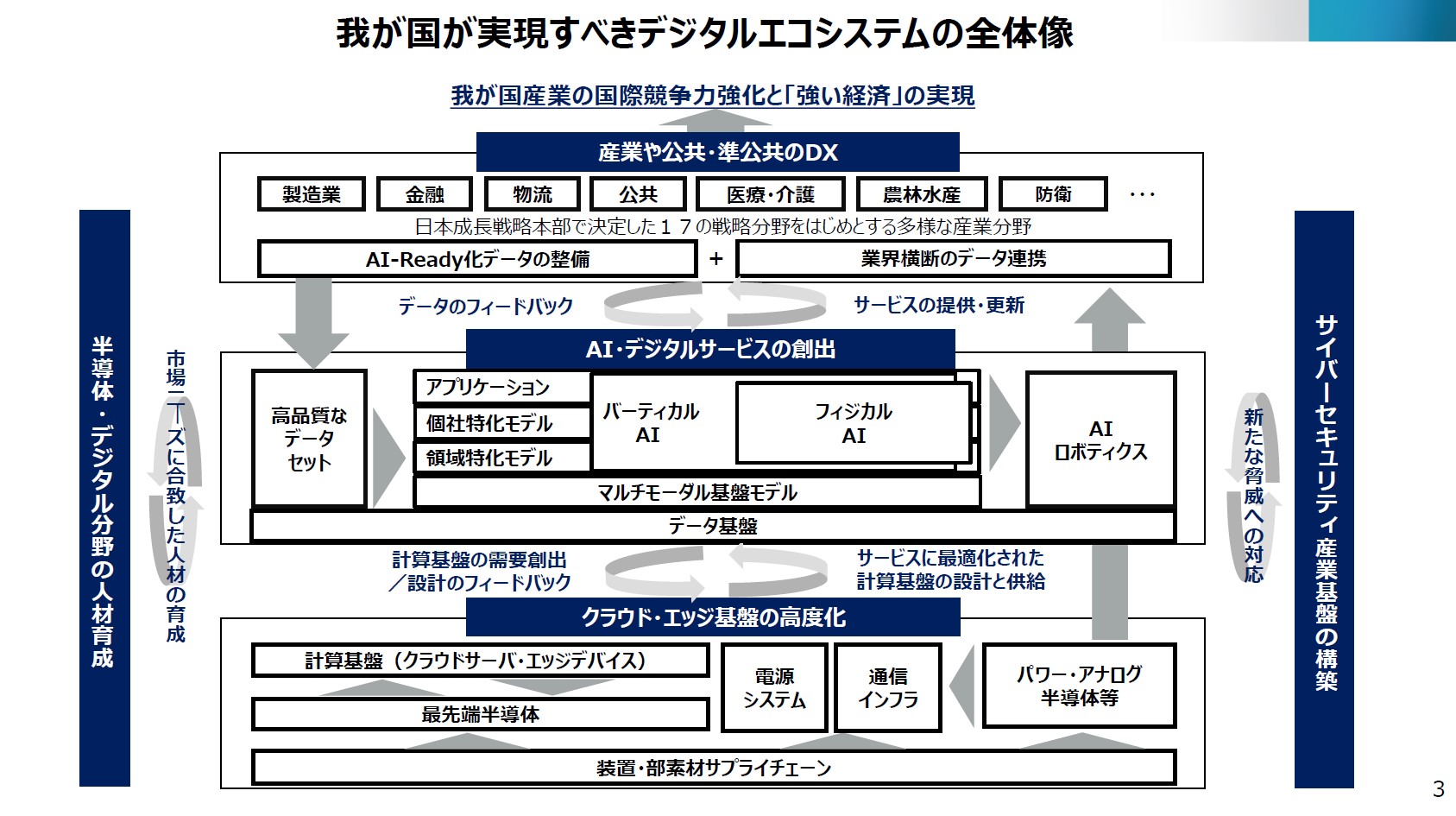 加えて、サービスの高度化は、クラウドやエッジの計算基盤、通信・電源インフラ、半導体への需要を押し上げるとともに、人材確保やサイバーセキュリティ対応の重要性も高めます。すなわち、「デジタルサービスの社会実装 → データの蓄積 → AIモデルの高度化 → 計算基盤・半導体の強化」という好循環をいかに構築し、加速させるかが施策の中核となります。