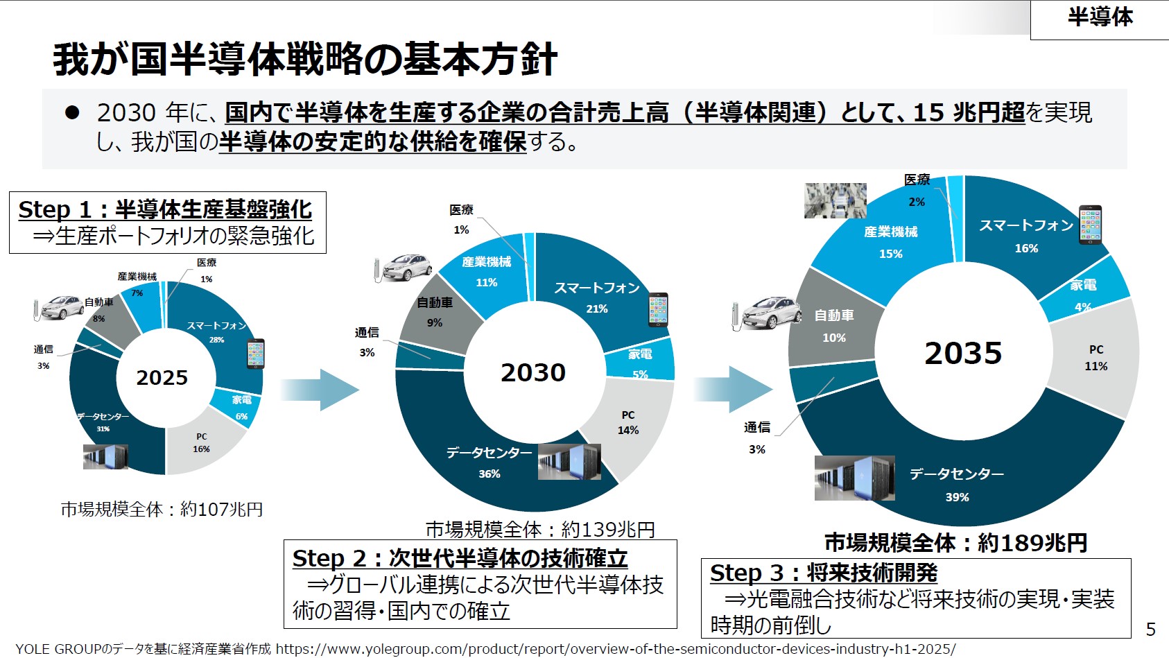 半導体市場は、2025年の約107兆円から2035年には約189兆円へと拡大が見込まれており、特にAIデータセンター分野の成長が見込まれます。こうした背景のもと、政府は2030年度までの7年間で10兆円以上のAI・半導体支援を実施し、これを呼び水としてその後10年間で50兆円超の国内投資を実現する方針です。