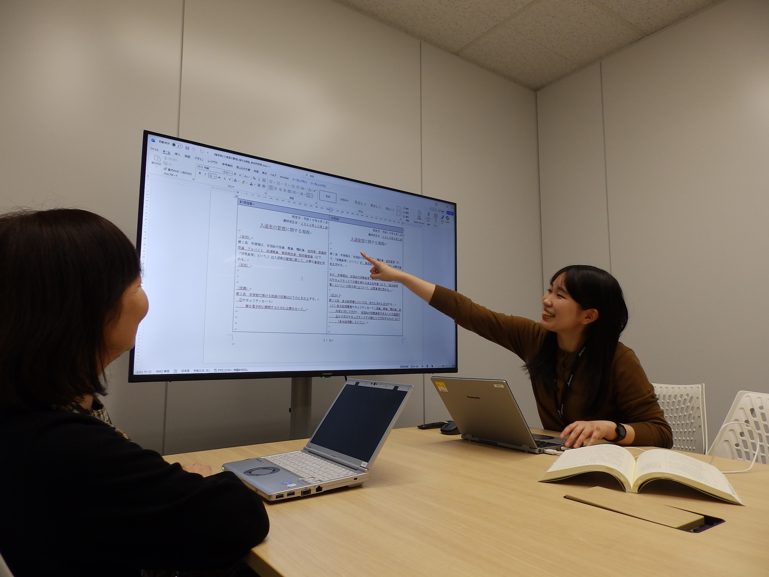 オフィスのレイアウト変更に伴い、改正が必要な規程対応を行います。規程独特の言葉づかいや、抜け漏れがないように改正することに苦戦していますが、専務や上長、先輩からアドバイスをいただきながら取り組んでいます。