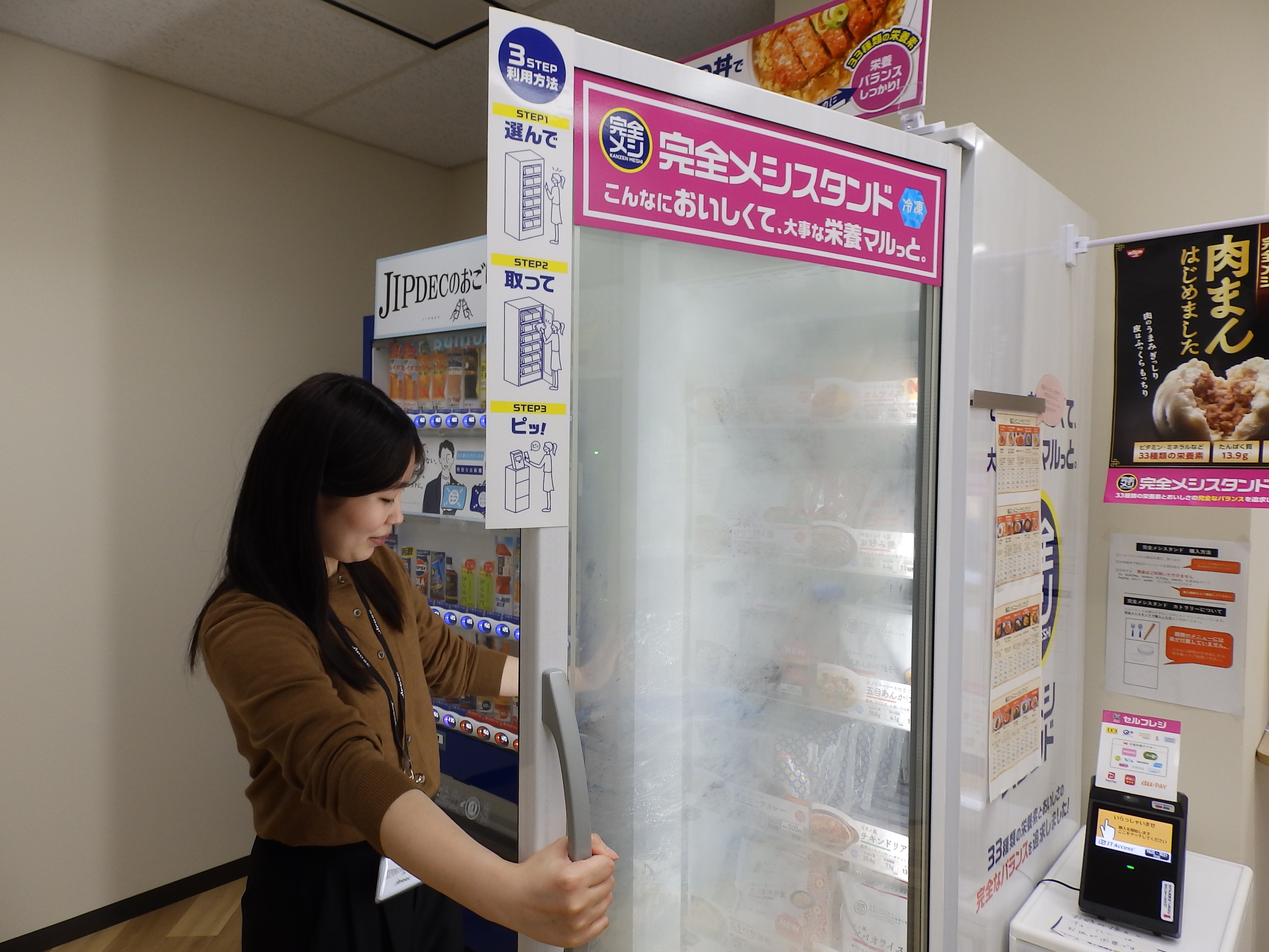 この日は、社内にある自販機から完全メシを購入し、先輩方と一緒に食べました!自席以外でも話せるスペースがあるので、そこで食べることもあります!