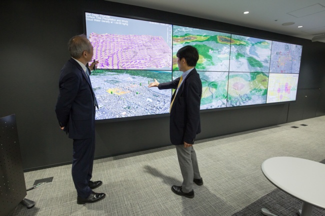 ビッグデータ分析の技術展示。ビッグデータに基づき、京都市の天候シミュレーション、交通シミュレーション、ソーシャル分析を行う。