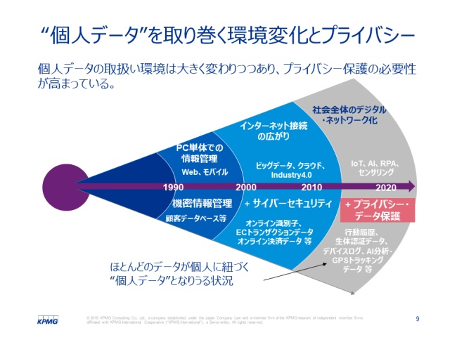 KPMGが2017年に世界24か国で行った消費者のプライバシーに関する意識調査では、企業のデータ管理に対し、56%が強い懸念を抱いており、特に中国、インド、シンガポールでは企業への信頼度が低かった。また、業種別でみると公益企業に対しても高い懸念を持っており、消費者は、Cookieの設定やSNSの設定変更などで能動的に自らを守ろうとしている。しかし日本の回答者は、企業に個人データを渡したくないという回答が最も多かったにも関わらず、プライバシー保護のための行動をとっている割合が24か国の中で最も低く、具体策を理解していないという結果が出た。