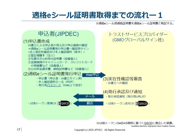 実際の手続きについてご説明します。現在のところ、国内にはeIDAS規則の適格eシールの電子証明書発行サービスはなく、JIPDECではGMOグローバルサイン社の英国法人に依頼しました。
