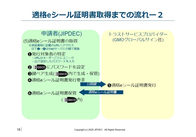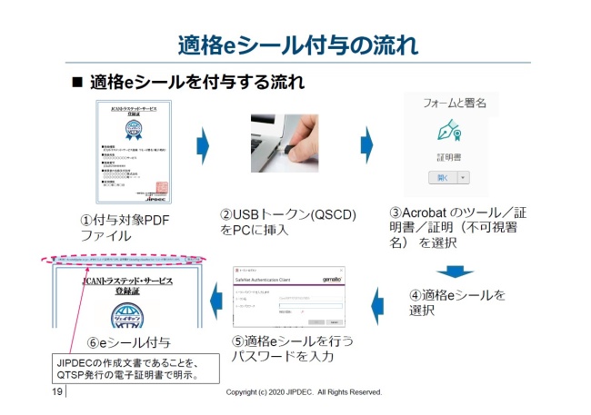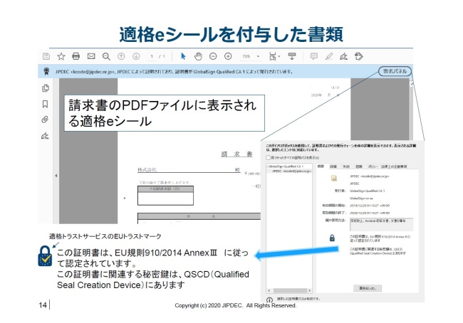 なお、JIPDECは2020年より、適格eシールの使用を開始しました。現在、JIPDECがトラストサービス評価事業向けに出す登録証(PDFファイル)には、適格eシールをつけて送付する運用を行っています。