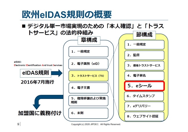 2016年7月に施行されたeIDAS規則の章構成の中に「トラストサービス」があり、その節構成に「電子署名」や「タイムスタンプ」などとあわせて「eシール」があります(図1)。