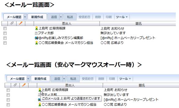 ※3 安心マーク:Webメール事業者側のサーバ上で「送信者からの正しいメール」と自動認識した場合に表示するアイコン画像。